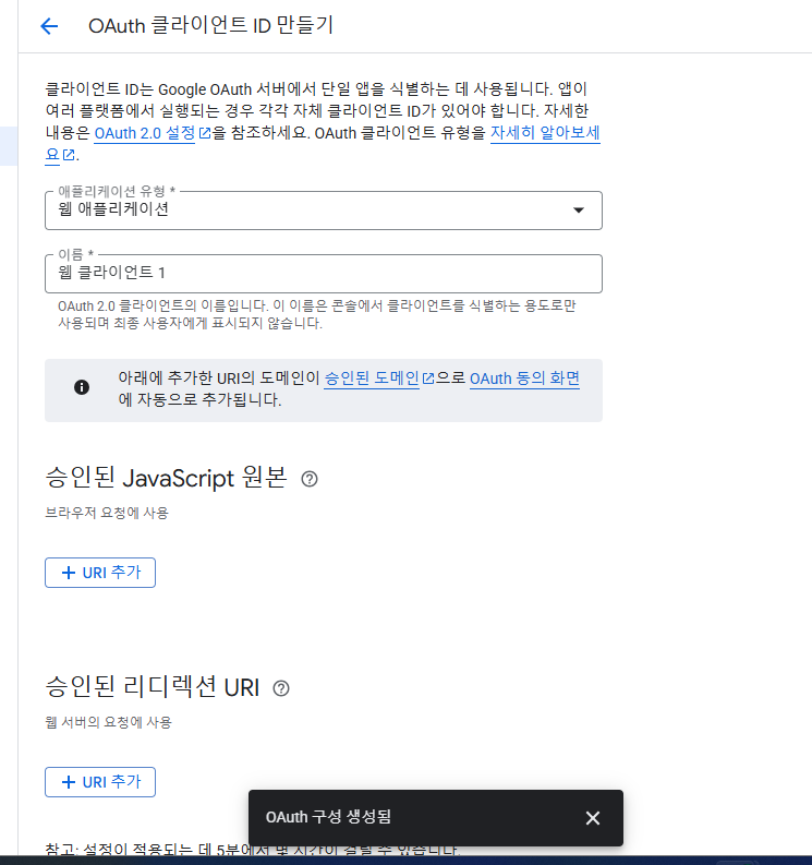 ๋์ถฉ ์ ์ด์ฃผ๊ณ ์๋ฃํ๋ฉด ๋๊ณ ์๋ OAuth 2.0 ํด๋ผ์ด์ธํธ ID ๋ง๋ค๊ธฐ๋ฅผ ์ ํํ๋ค.