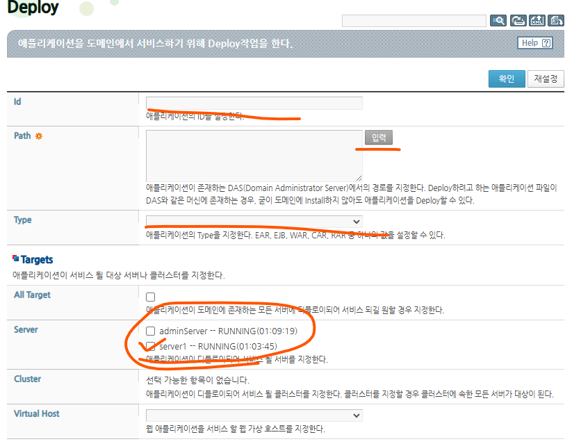 id, path์๋ warํ์ผ ๊ฒฝ๋ก, type์ war ๊ทธ๋ค์ ์๋ฒ๋ adminServer๋ฅผ ์ ์ธํ ๋ด๊ฐ ๋ง๋ server๋ก ํด์ฃผ๋ฉด ๋๋ค.