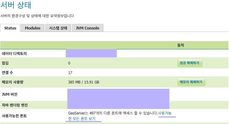 geoserver๊ฐ ์ค์น๋ ์๋ฒ ๋ด์์ ํฐํธ๊ฐ ๊น๋ ค์์ง ์์ผ๋ฉด ์ ๋๋ก ์ธ์์ด ๋์ง ์์ต๋๋ค.