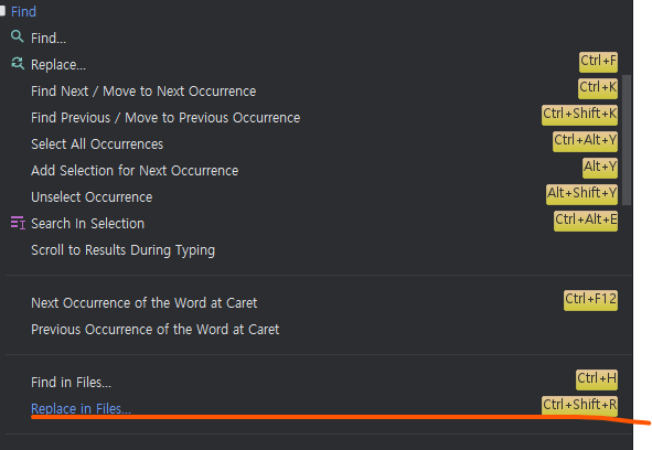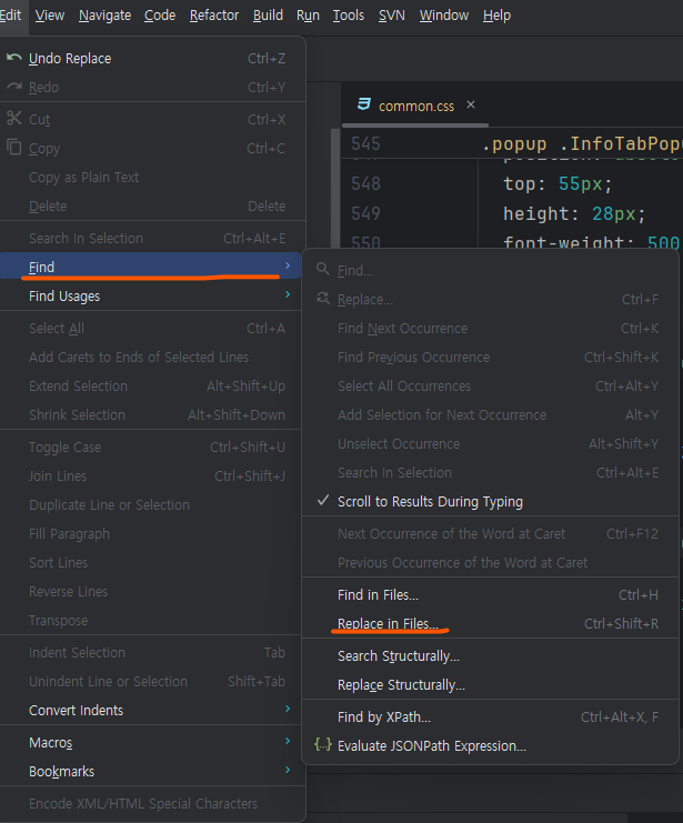 ์ฌ๊ธฐ์ Edit - Fine ํด๋์ Replace in Files...๊ฐ ์์ต๋๋ค.