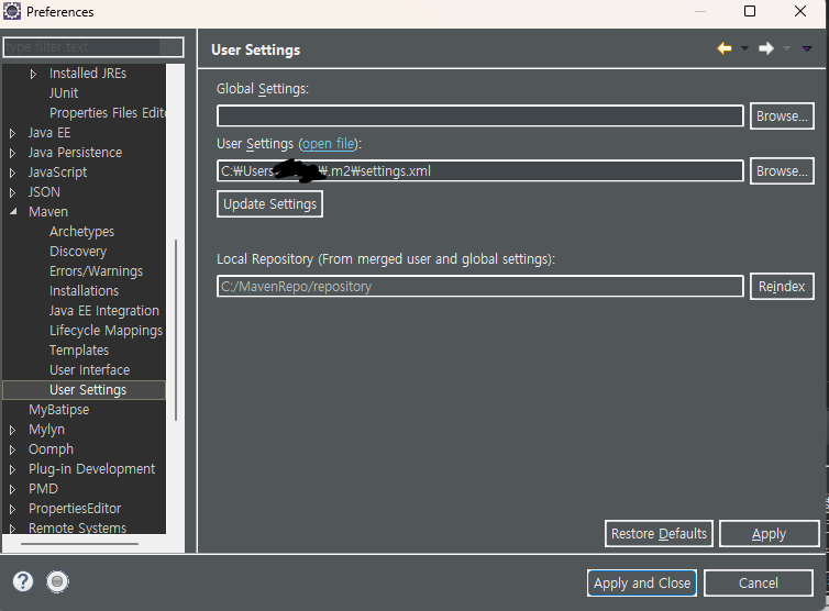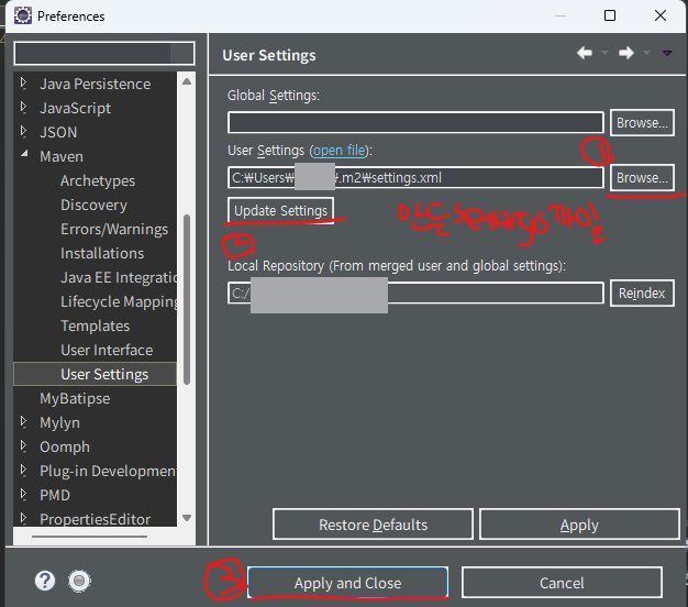 3. ๊ฒฝ๋ก๋ฅผ ๋ฐ๊พผ settings ํ์ผ์ ์ดํด๋ฆฝ์ค maven user settings์ ์ ์ฉํ๋ค.