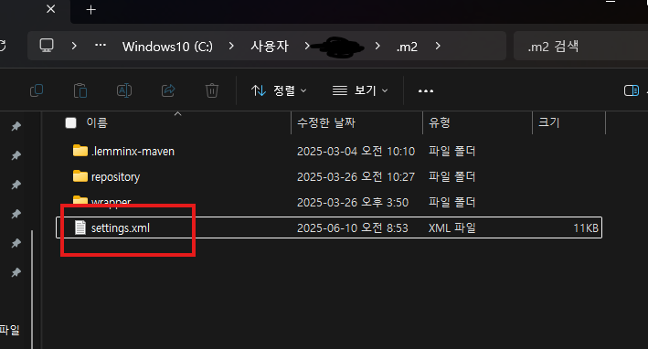 2. ๋ฐ์ settingํ์ผ์ user/์ฌ์ฉ์/.m2 ํด๋ ์์ ๋๊ณ