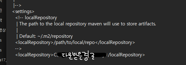 ๊ทธ ํ์ผ ์์ local repository๊ฒฝ๋ก๋ฅผ ์๋ก ๋ค์ด๋ฐ์ maven repository ๊ฒฝ๋ก๋ก ๋ฐ๊ฟ์ค๋ค.